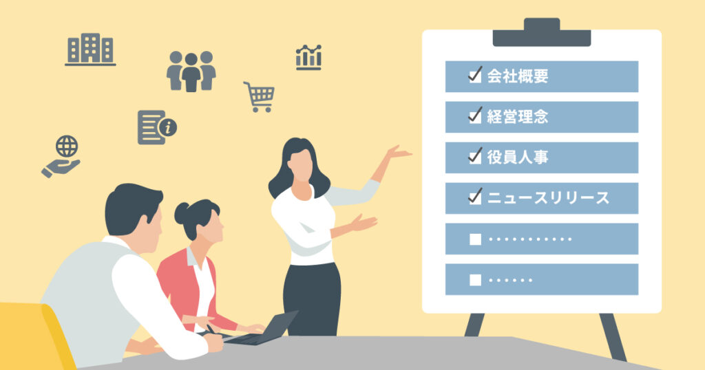 明確な決まりがあるわけではありませんが、会社概要や事業内容、経営理念、採用情報、ニュースリリースなどを掲載するケースが多いです。