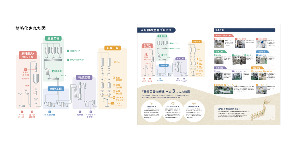 実際の機械はより複雑ですが、パンフレットを手に取った方が直感的に理解できるように、お米が米粉になるまでの流れを図式化し、各工程で使われる機械の役割を視覚的に把握できるように整理しています。