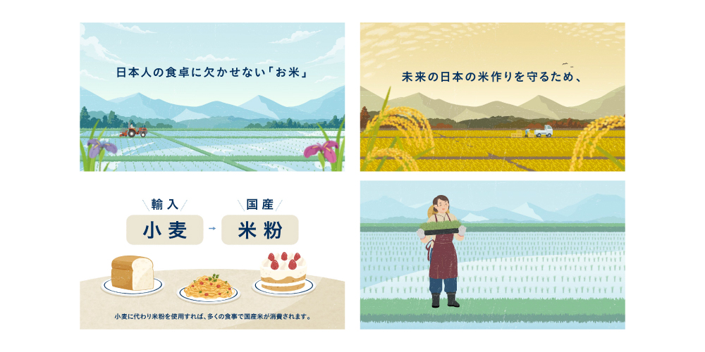 動画後半では、米粉がつくられる工程をより具体的に伝えるため、工場内の実写映像に加えCGによる解説を挿入。専門的になりがちな工程も、視覚的に理解しやすい構成としました。