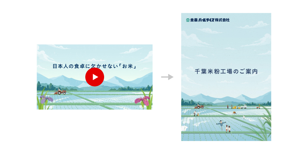 今回の制作では、「専門的な内容を、できるだけわかりやすく親しみやすく伝えること」を大きな軸としています。米粉や製造工程は、一般の方にとってなじみの薄い分野です。そこで、難しい説明をそのまま並べるのではなく、イラストや写真などのビジュアル表現を活用しながら、工場の全体イメージが分かりやすいパンフレットを目指しました。動画とパンフレットを別々のツールとして制作するのではなく、トーンやビジュアルを統一することで、どちらを見ても同じメッセージが自然に伝わるよう設計しています。
