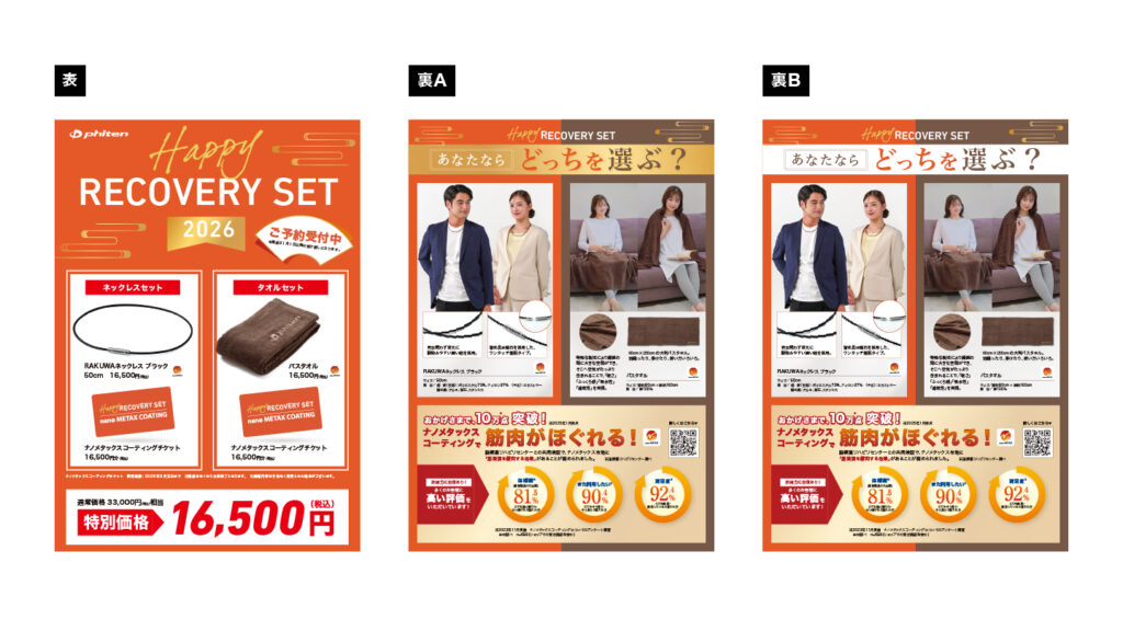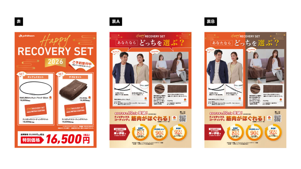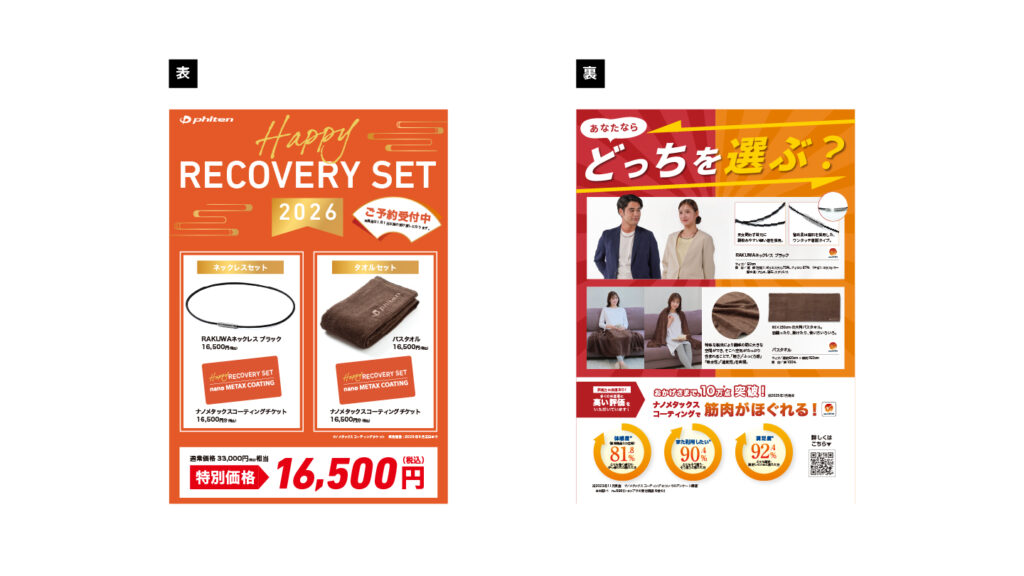 裏面は、視線の流れを意識した比較レイアウトを採用。情報を整理した状態で、2つのセットの違いが直感的に理解できるデザインに仕上げました。