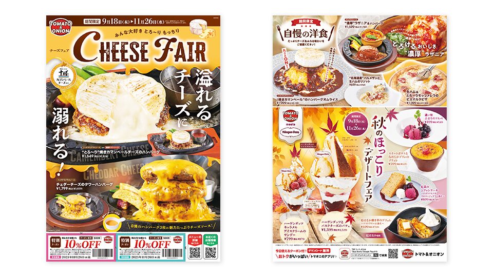 メインであるチーズ料理が映える構成を意識してシズル感があるデザインにしました。キャンペーン内容に合わせたキェンペーンロゴも弊社で制作しております。裏面のデザートも季節のイメージに合わせてデザインしました。