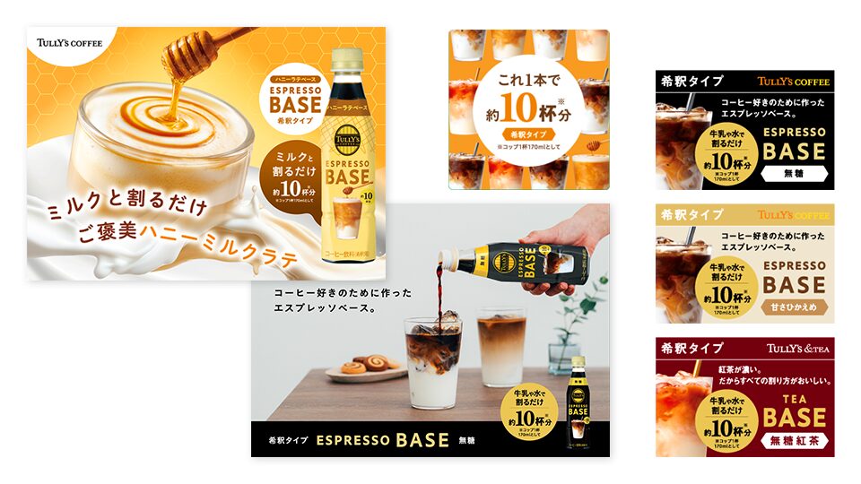 ハニーミルクラテのポスターについては、デザインを新規で作成しており、新商品の訴求ポイントであるハチミツの“とろっと”した質感や濃厚さを全面的に表現し、視覚的に強く訴求できるビジュアルにこだわりました。レールPOPとアテンションPOPについては、既存のツールを活かして制作することで、安価でスピーディに納品できるようご提案いたしました。