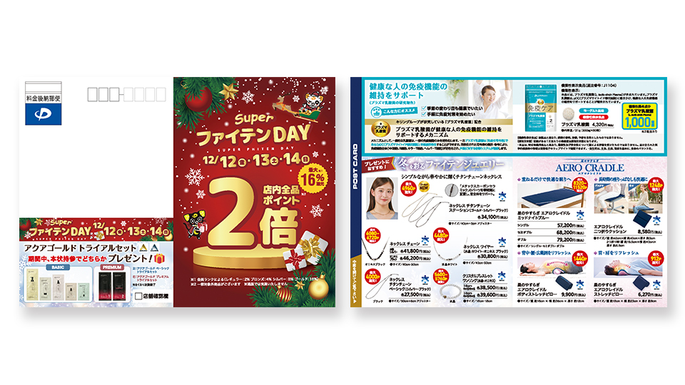 ファイテンショップ全店で企画される販売キャンペーンの告知用V折圧着DMをデザイン、印刷までワンストップで制作させて頂きました。