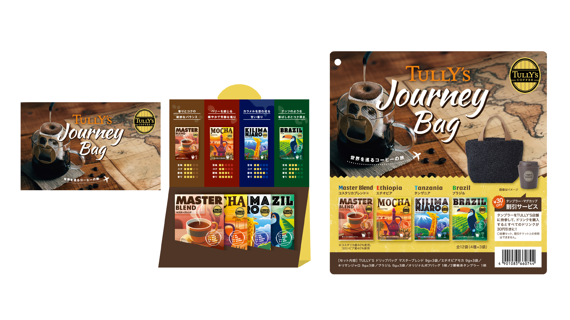 世界各国のコーヒーを詰め合わせている商品のため、バッグひとつで世界を旅する気分を楽しめるようなデザインにしております、。