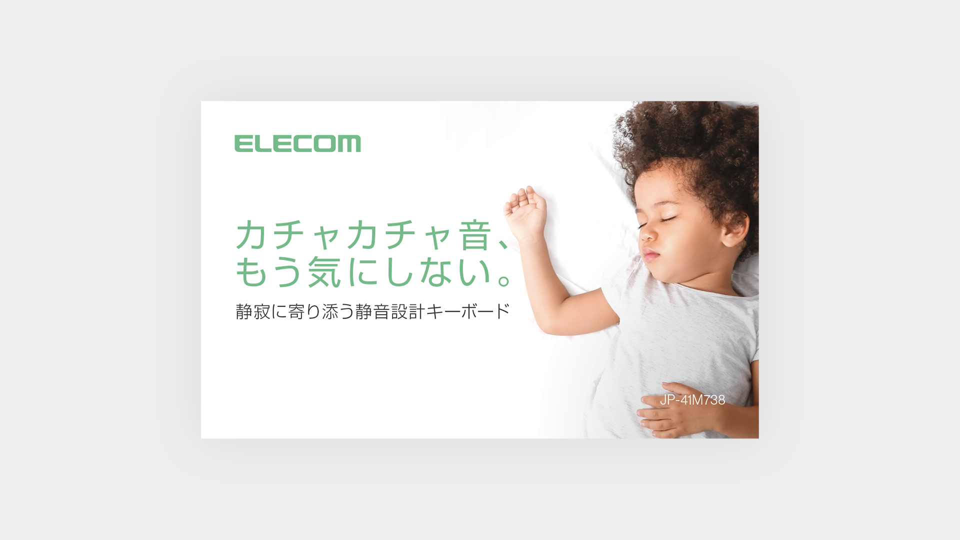 静音キーボードの販促用 名刺サイズのPOPを制作しました。小さなサイズでも一目で「静かさ」が伝わるよう、赤ちゃんが眠るビジュアルを大きく使用し、最小限の情報で訴求いたしました。
