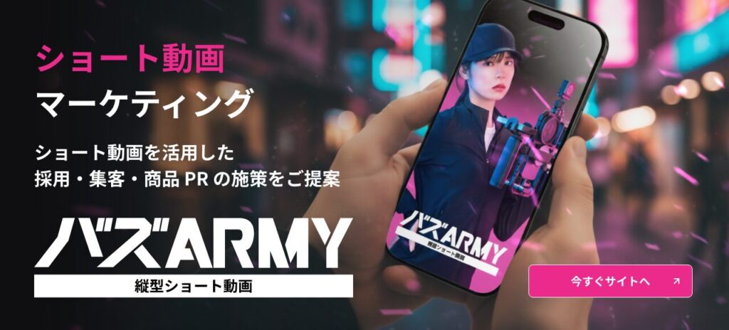 撮影・編集・運用・広告までを一貫してサポートするバズARMYのサービスをご紹介していますので、ぜひご覧ください。