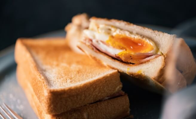 カリカリベーコンと半熟風たまごをサンド。朝食にもボリューム満点!