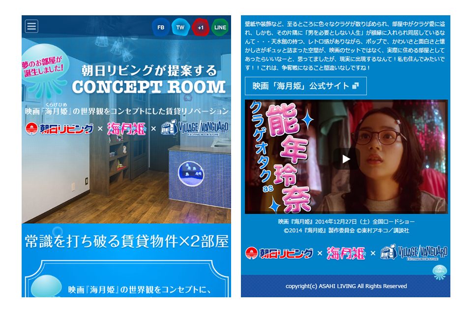 賃貸物件リノベーション・個人宅リフォームの株式会社朝日リビング様と、映画「海月姫」、そしてヴィレッジバンガードがタッグを組んで提案するコンセプトルーム特設ページを作成。背景にクラゲがゆらゆらと漂い、水中をイメージした泡が動くなど、HTML5 CSS3 jQueryにて遊びゴコロ満載の楽しさを演出。