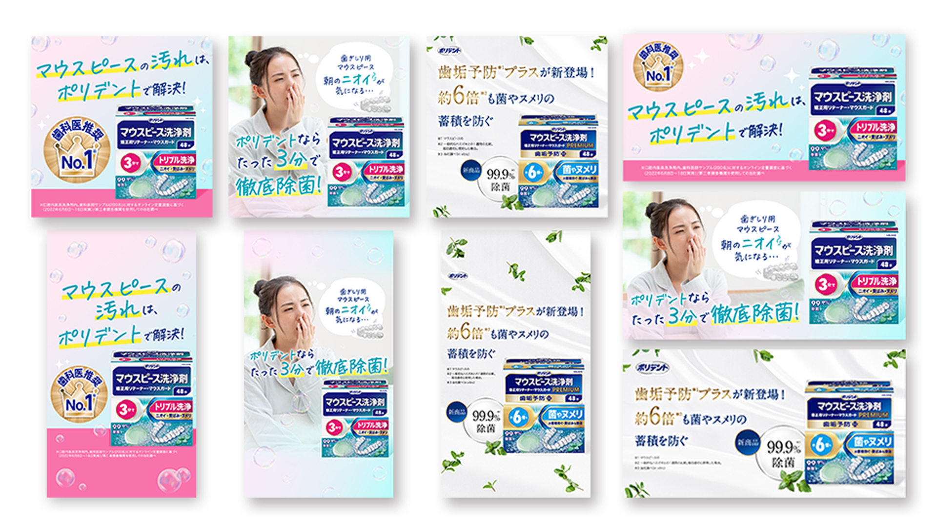 ポリデントの新商品プロモーション用バナー制作をご依頼いただきました。ご支給いただいたのは訴求内容とメインコピーのみでしたが、弊社デザイナーが効果的な画像提案からデザイン制作までワンストップ対応。さらに、ABテストに最適な複数のトンマナ展開を行うことで、ユーザー反応を比較・改善しやすいバナーを実現しています。